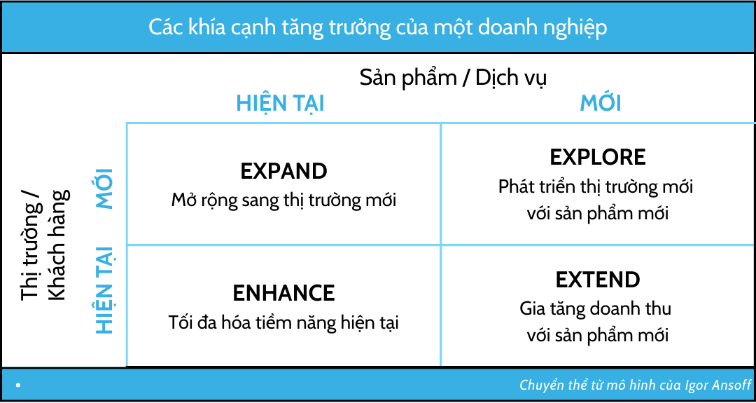Tuy nhiên, một chiến lược tăng trưởng cần có định hướng rõ ràng, xác định gốc rễ của nguồn tăng trưởng và yêu cầu về phát triển kinh doanh kèm theo đó. Trong cuốn sách Corporate Strategy, tác giả Igor Ansoff đã chỉ ra rằng, về cơ bản, doanh nghiệp có hai hướng tăng trưởng chính: Phát triển sản phẩm/dịch vụ (bán sản phẩm hiện có hoặc sản phẩm mới) hoặc Mở rộng thị trường/khách hàng (bán cho khách hàng hiện tại hoặc khách hàng mới).