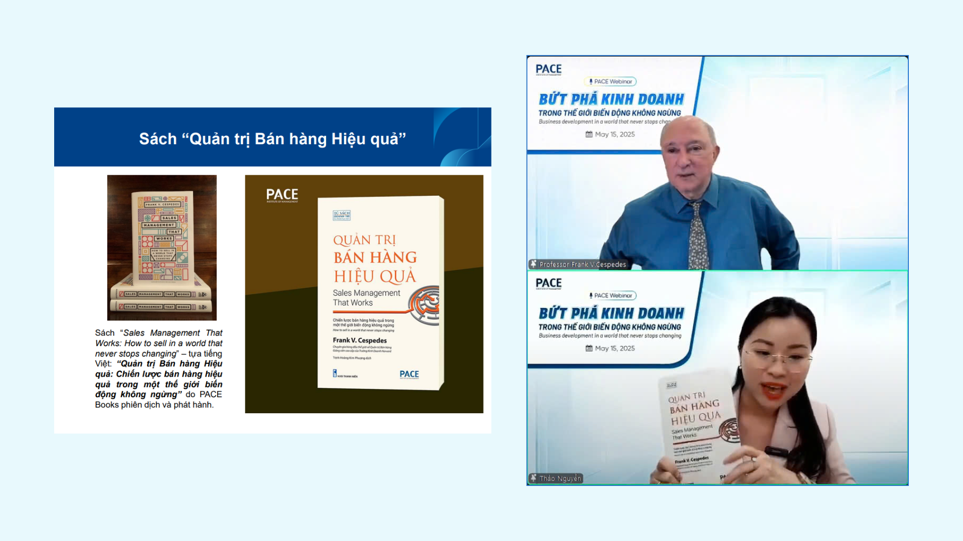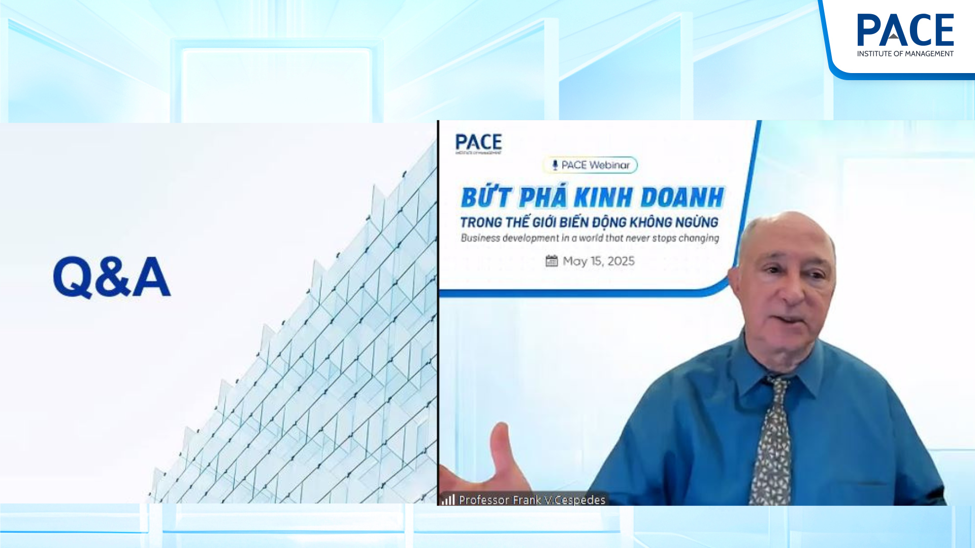 Sáng ngày 15/5/2025, tiếp nối chuỗi PACE Webinar nhằm đồng hành cùng cộng đồng doanh nghiệp đi xuyên biến động, buổi PACE Webinar cùng Tiến sĩ Frank V. Cespedes, Giáo sư Trường Kinh Doanh Harvard, Chuyên gia hàng đầu thế giới về Chiến lược & Quản trị Bán hàng - đã diễn ra với sự tham dự của gần 500 nhà lãnh đạo, quản lý các cấp, và doanh nhân trên toàn quốc.